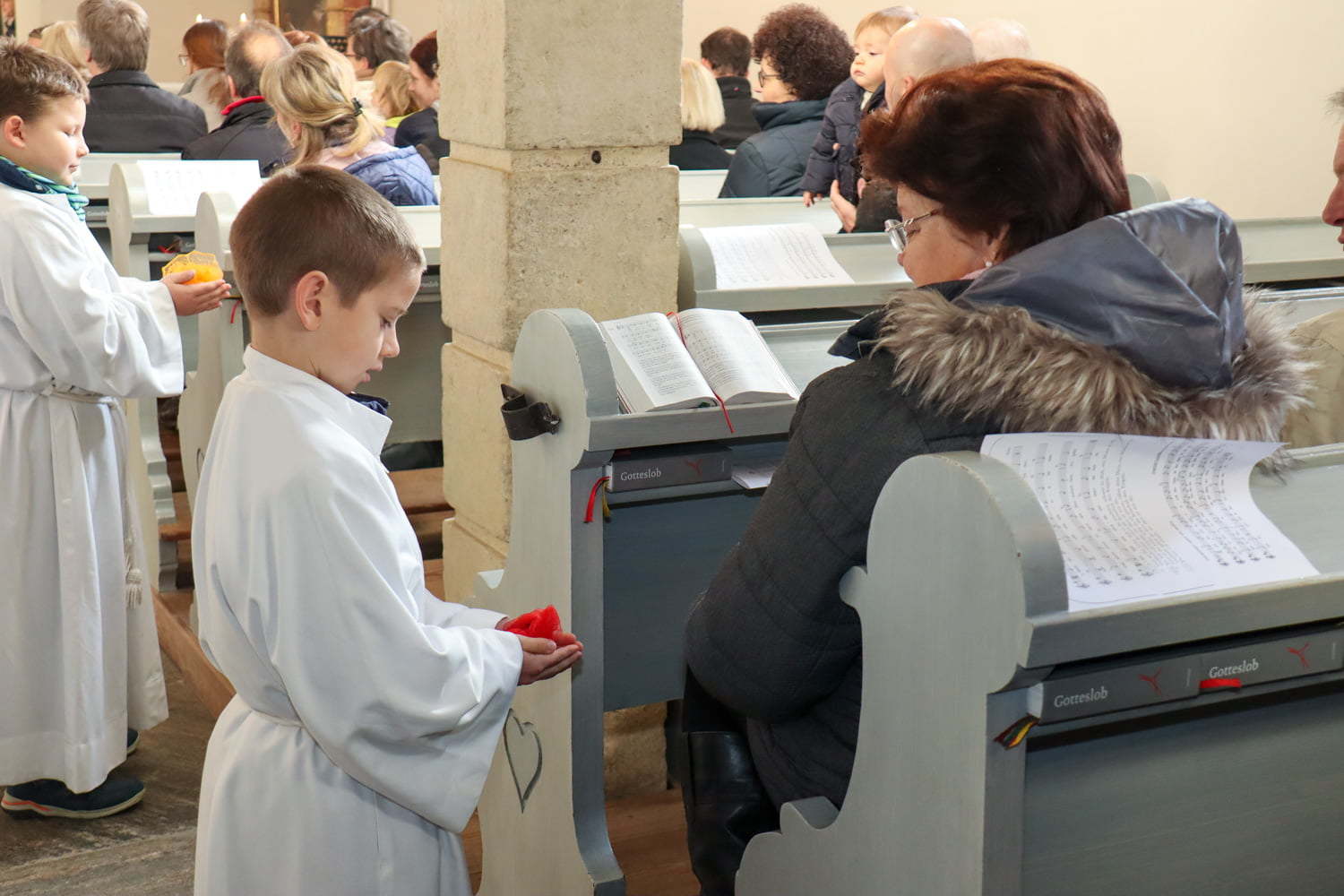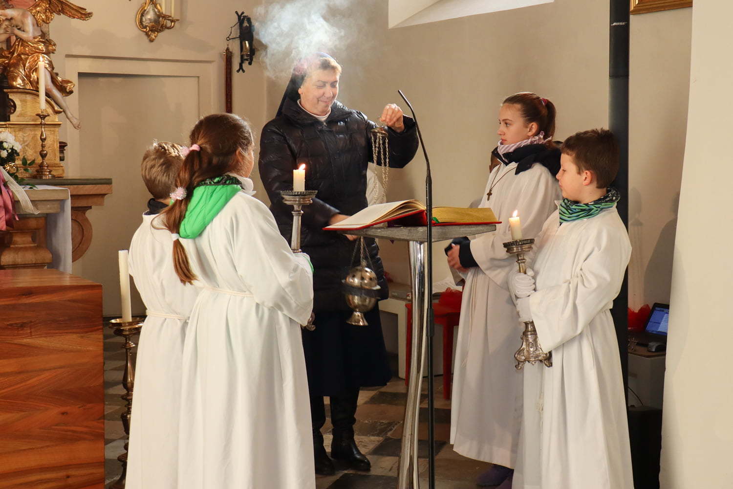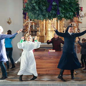 In der Wortgottesfeier ist mehr Raum für neue Elemente. So tanzte Barbara Koren mit einigen Frauen und Kindern den Tanz „Samen der Liebe“. Gebet ist nicht nur reden, singen, still sein … sondern auch mit Leib und Seele, mit dem ganzen Körper meinen Glauben zum Ausdruck zu bringen. Vor dem Segen zeigten die Kinder mit einer symbolischen Handlung – das Aufblühen „einer Blüte“ mit Seidentüchern – was es bedeutet, füreinander zum Segen zu werden.