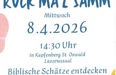 Die Pfarre St. Oswald lädt sehr herzlich zum Ruck ma z`samm am Mittwoch, den8. April, um14:30 Uhr im Lazarus-Saal in St. Oswald ein.Thema: Biblische Schätze entdeckenReferent: Engelbert Schmied,...